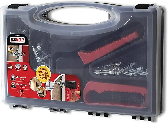 Oubliez les chevilles en plastique rouge ou blanche dans le placo : elles s’arrachent. Pour le placo, il faut impérativement une Cheville Molly. Elle s’ouvre comme un parapluie métallique derrière la plaque pour répartir la charge sur une grande surface.